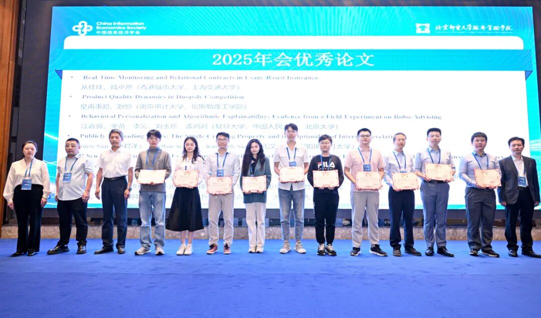 博士生论坛主持人点评精彩瞬间(自上而下分别为:王翀、马良、孙一飞、许伟、余建宇、吴小龙、周中允、曹志刚、熊一凡)论坛采用“10分钟展示+10分钟互动”的互动交流机制,推动信息经济领域的理论探索与实证研究实现跨学科碰撞。这场学术盛宴充分展现了青年学者在机制设计、数据定价、博弈论等数字经济与管理领域的理论创新活力,为大会注入了蓬勃的学术朝气。经2025中国数字经济与管理学术年会程序委员会评选,南京大学常帅峰、李佳轩、袁勤俭《Integrating the Forgiveness Model and Stress-Buffering Hypothesis: An Emotional Pathway to Consumers’ Forgiveness in AI Service Recovery》,北京大学姜渭、赵文慧《Learning it Sooner or Later》,香港中文大学(深圳)王乔楚、长江商学院曾思棚、吉林大学周阔《Beyond Similarity: Using LLMs to Uncover Corporate Environmental Efforts from Investor-Company Q&As》,北京交通大学朱峰《Equivalence of Lindahl Prices and Core in a Collective Choice Problem》四篇博士生论坛论文,荣获2025中国数字经济与管理学术年会博士生优秀论文,中国信息经济学会每篇论文给予2000元人民币奖励。博士生优秀论文及年会优秀论文获得者证书颁发