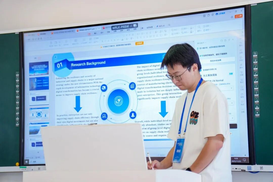 首先,来自杭州电子科技大学的项彬宸博士进行了题为《制造企业数字化转型同群效应对供应链韧性的影响研究》的论文分享。分享结束后,罗雨濛副主编针对该论文在研究背景、研究动机等方面存在的问题,从论文内容的优化要点以及英文论文展示技巧等方面予以详细指导。她指出,国内外论文的写作范式存在显著差异,要注重结合目标期刊的具体要求对论文内容进行相应调整。