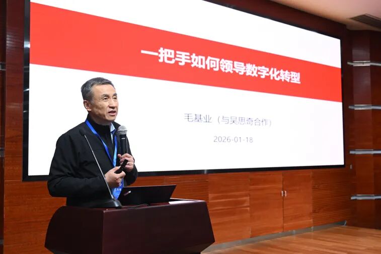 上海科技大学创业与管理学院院长毛基业教授进行了题为“一把手如何领导数字化转型?”的主旨报告。毛基业教授聚焦CEO如何有效领导数字化转型的重要议题,基于4家不同类型企业的质性研究,揭示了一把手领导数字化转型的过程机理,强调数字化转型绝非单纯技术升级,而是需要CEO主导推动的系统性组织变革。